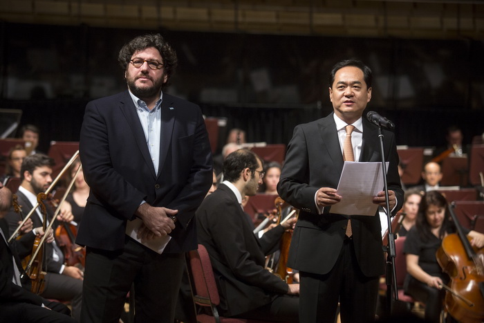 3月22日,慶祝中國-阿根廷建交45周年音樂會在位于布宜諾斯艾利斯的基什內爾文化中心(阿國家文化中心)舉行。中國駐阿根廷大使楊萬明與阿阿根廷文化部部長巴勃羅·阿維魯托出席并致辭。多名阿政府高級官員、企業界和文化界知名人士以及外國駐阿使節觀看了演出。