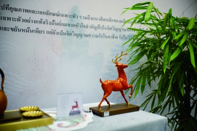 “這只鹿的形象是依照中國(guó)故宮博物院館藏珍品、清代宮廷畫(huà)家郎世寧所繪《秋林群鹿圖》設(shè)計(jì)的,現(xiàn)在經(jīng)過(guò)國(guó)家級(jí)非遺熔銅傳承人朱炳仁大師之手,把它從畫(huà)中‘請(qǐng)出來(lái)’變成立體的銅塑,采用百年傳統(tǒng)工藝及熱著色專利技術(shù)精制而成。”不久前在泰國(guó)曼谷中國(guó)文化中心開(kāi)幕的“造物記——來(lái)自中國(guó)的創(chuàng)意禮物”展覽現(xiàn)場(chǎng),泰國(guó)志愿者們?yōu)楝F(xiàn)場(chǎng)觀眾講述文創(chuàng)產(chǎn)品《綻鹿頭角》背后的故事。