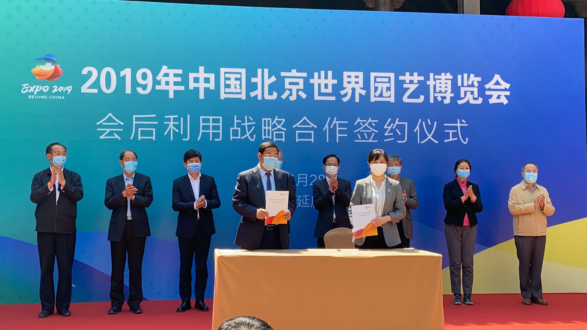 圖片說(shuō)明:在李金生書(shū)記及北京市文旅局、延慶區(qū)政府及北京世園局領(lǐng)導(dǎo)的見(jiàn)證下,中國(guó)文化國(guó)際旅行社有限公司總經(jīng)理王璐與北京世園投資發(fā)展有限公司領(lǐng)導(dǎo)簽署戰(zhàn)略合作協(xié)議。