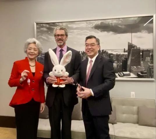 揭幕儀式前,黃屏總領事向帝國大廈總裁安東尼·馬爾金贈送了由中國對外文化集團有限公司設計制作的“歡樂春節”兔年吉祥物。