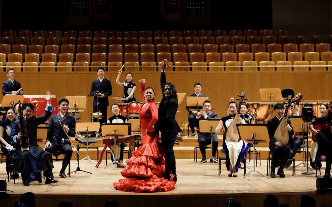 開(kāi)幕音樂(lè)會(huì)由中央民族樂(lè)團(tuán)、北京京劇院與西班牙馬德里大區(qū)管弦樂(lè)團(tuán)、弗拉門戈樂(lè)隊(duì)聯(lián)袂呈現(xiàn)。兩國(guó)樂(lè)團(tuán)演奏了融合中西音樂(lè)特色的新創(chuàng)曲目《陽(yáng)光永遠(yuǎn)照耀著我們的友誼》,靈感源于中國(guó)樂(lè)曲《陽(yáng)光照耀著塔什庫(kù)爾干》和西班牙樂(lè)曲《流浪者之歌》;《貴妃醉酒》讓西班牙觀眾領(lǐng)略了京劇的獨(dú)特風(fēng)采;西班牙女高音歌唱家瑪斯瑅用中文演唱《我愛(ài)你中國(guó)》,傳遞了中西友好的情誼,深深感染了現(xiàn)場(chǎng)觀眾;中央民族樂(lè)團(tuán)團(tuán)長(zhǎng)趙聰與西班牙音樂(lè)家演奏的《玫瑰探戈》展現(xiàn)了中西合奏友好旋律、唱響美美與共的獨(dú)特魅力,將演出推向高潮。兩國(guó)藝術(shù)家以樂(lè)會(huì)友、以藝通心,充分體現(xiàn)了東西方文化的互融互鑒。