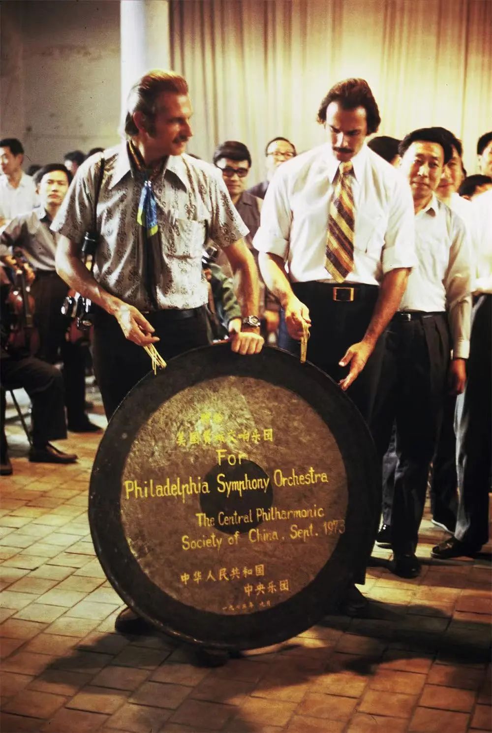1973年,費(fèi)城交響樂團(tuán)中國(guó)之行收到中央樂團(tuán)贈(zèng)予的禮物:一面直徑1.1米的大鑼。