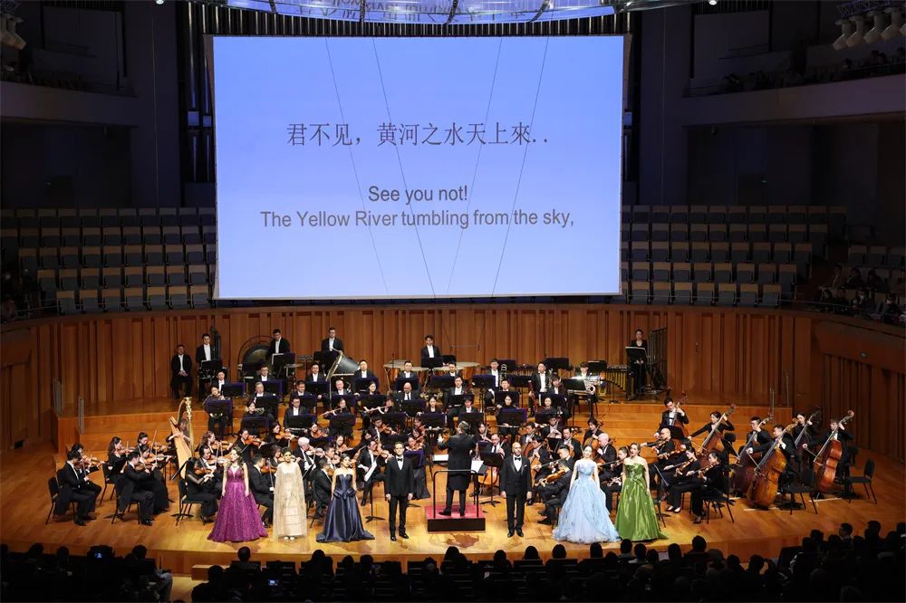 “唐詩(shī)的回響”音樂會(huì)選段在詩(shī)仙李太白的名篇《將進(jìn)酒》中收尾,也結(jié)束了上半場(chǎng)的演出。“與君歌一曲,請(qǐng)君為我傾耳聽。”男、女歌唱家們協(xié)力將《將進(jìn)酒》的五音繁會(huì)、氣象不凡演繹得大開大合。“詩(shī)情忽翕忽張,情極悲憤而作狂放,語(yǔ)極豪縱而又沉著。”可謂意境全出。
