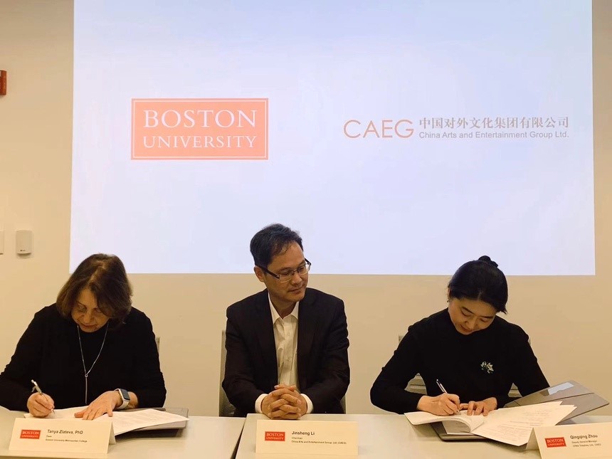 簽約儀式上,在中國對外文化集團有限公司董事長李金生與波士頓大學大都會學院藝術管理專業學術事務副院長盧·奇庫舍夫、國際項目主任凱瑟琳·鄧克利、藝術管理專業主任道格拉斯·德納塔爾、倪德倫環球娛樂公司總裁羅伯特·倪德倫共同見證下,中國對外文化集團職工董事、中演演出院線發展有限責任公司副總經理周青青與波士頓大學大都會學院院長坦尼婭·茲拉特瓦簽署合作協議。