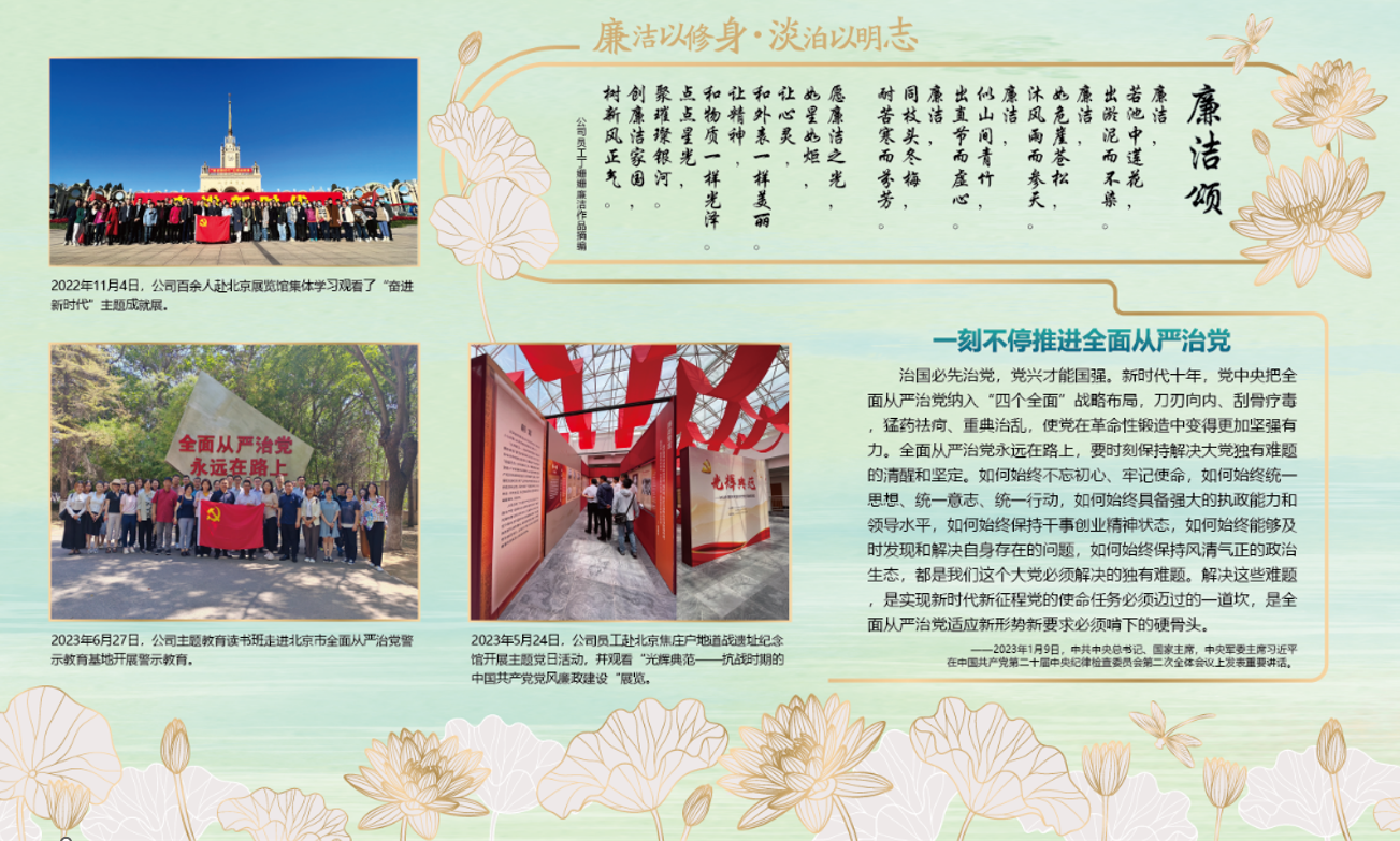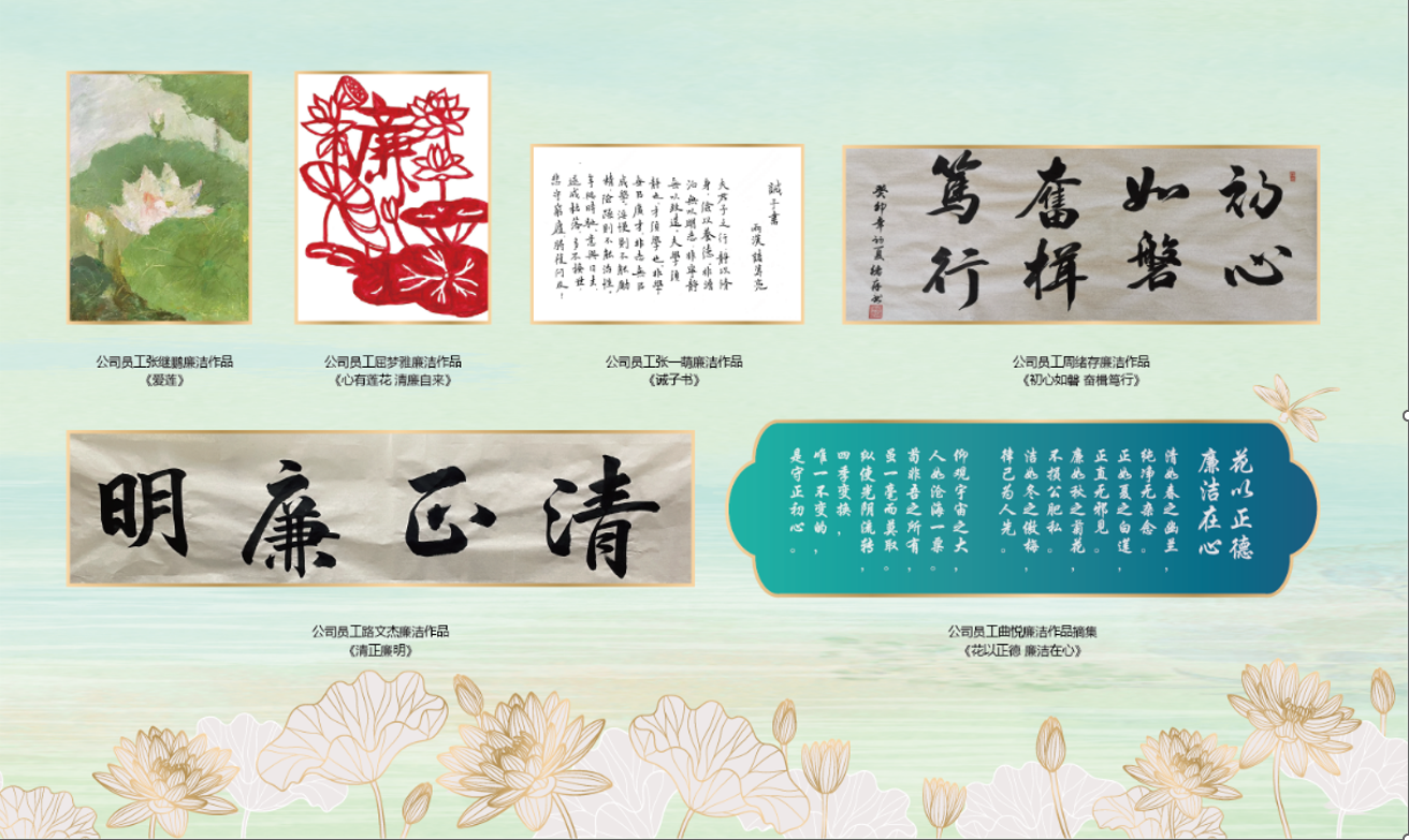 2023年,公司紀委按照集團紀委工作部署,組織開展“廉潔文化教育月”活動,共征集34篇“清正在德,廉潔在志”主題家風家訓征文和156件攝影、書法、繪畫等廉潔文化主題作品,以“德鑄忠誠廉潤紫荊”為主題開展廉潔文化長廊建設(shè),把嚴的要求傳遞到最基層。2025年,推動開發(fā)廉潔文創(chuàng)產(chǎn)品,制作了蓮花主題的桌墊,在廉潔文化主題黨日活動中發(fā)放,受到了公司廣大干部員工的喜愛,通過這一日常工作中高頻率使用的文創(chuàng)產(chǎn)品,最大程度釋放了廉潔文創(chuàng)產(chǎn)品的影響力。