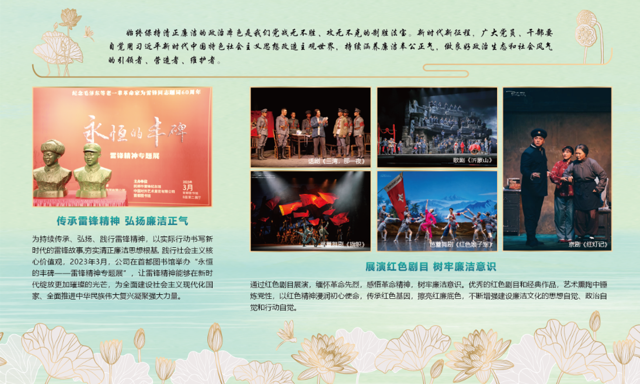 近年,公司紀委加強督促指導基層黨支部用好《廉政教育系列參考片》,利用“三會一課”開展廉潔文化教育。2024年共組織12個黨支部共計169名黨員觀看警示教育片,引導黨員領(lǐng)導干部受警醒、明底線、知敬畏;組織公司在京黨員、入黨積極分子等98人赴北京市廉政教育基地——“明鏡昭廉”明代反貪尚廉歷史文化園,從中華優(yōu)秀傳統(tǒng)文化中汲取智慧營養(yǎng)、凝聚思想共識;指導直營劇院黨支部深入挖掘所在地警示教育資源,比如泉州大劇院組織黨員干部赴清廉泉州館開展“打卡清廉泉州館,厚植廉潔底色”主題黨日活動,海南東方大劇院黨支部組織黨員參觀東方市警示教育基地。