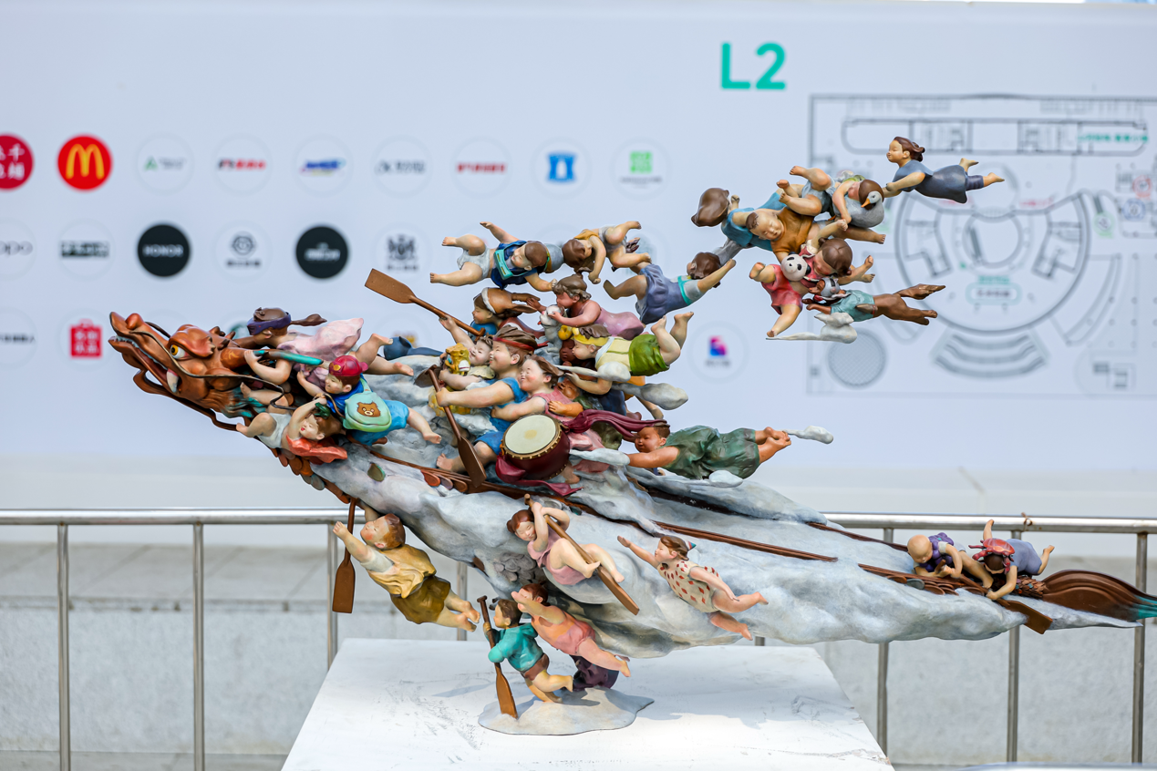 除新質影像作品,展覽現場還融合了其它公共藝術裝置、多媒體燈箱等多形式藝術創作,進一步激活了展覽場域的空間聯結,深化公眾參與體驗。深圳藝術家鄭躍飛創作的公共裝置《星之塔》,采用可持續環保板材與創新榫卯結構搭建而成,裝置層層向上延展,在空間中構筑出星穹般的浪漫意象,生動呼應“青年匯聚·創造無界”的展覽主題。藝術家沈夢瑤的《踏夢神舟》借嶺南龍舟文化,以超現實手法,展現團隊協作等龍舟精神,承載青年憧憬,追求“超越無界、奔赴未來”的意境。